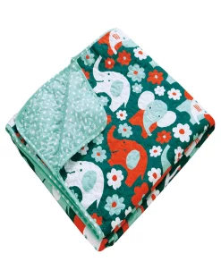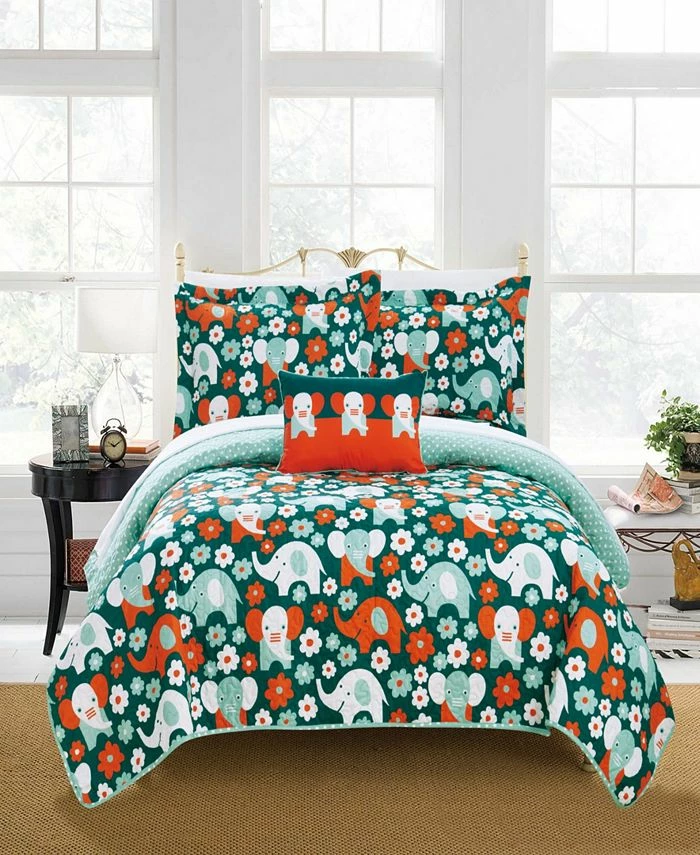 A fun and colorful quilt set perfect for back to school (or college) with everything you need to a transform a child’s bedroom or a dorm. The quilt features a cute “Elephant Party” theme complete with elephants a’ trampling and floral details on a dark green field with a two-tone polka dot pattern print on the reverse. A design coordinated reversible pillow sham and a reversible “Elephant” decorative throw pillow are included to complete the look.
