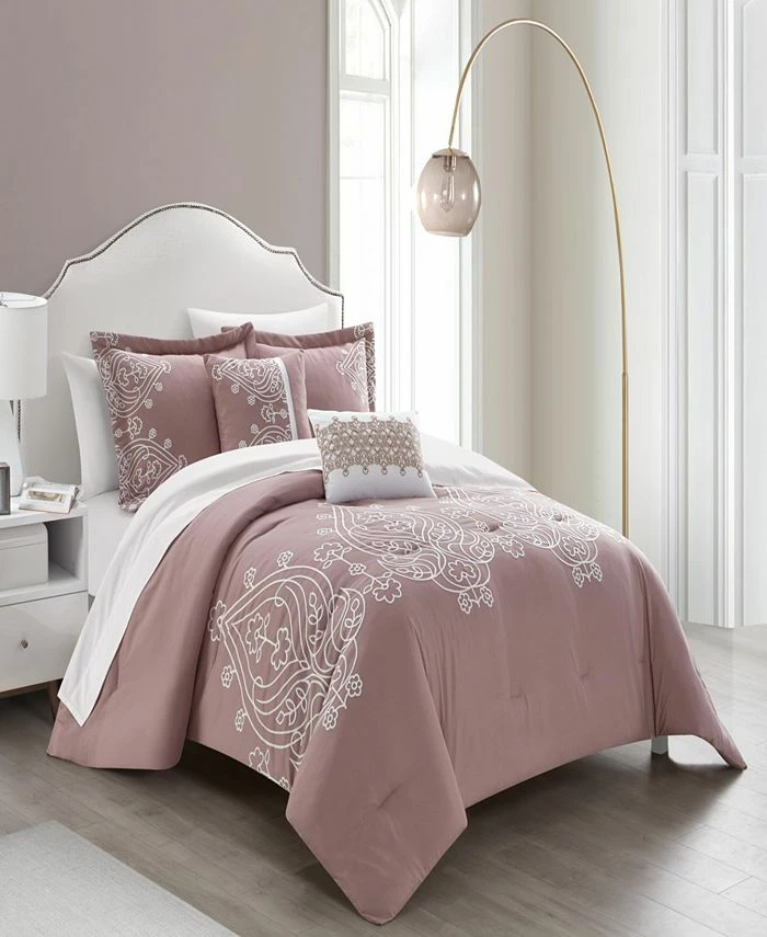 Give your bedroom a clean, new look with the unique style of the Gigi comforter set from chic home. This comforter features an embroidered paisley and scroll design. Two design coordinated pillow shams and two decorative pillows are included.