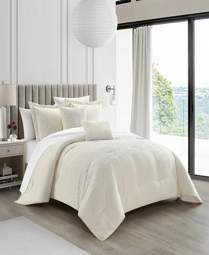 Give your bedroom a clean, new look with the unique style of the Gigi comforter set from chic home. This comforter features an embroidered paisley and scroll design. Two design coordinated pillow shams and two decorative pillows are included.