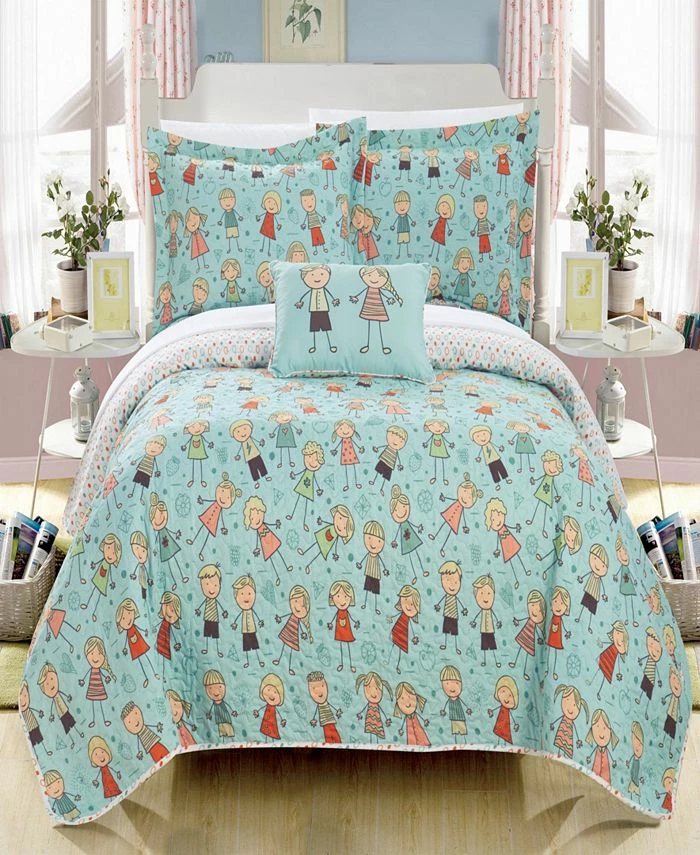 A fun and colorful quilt set perfect for back to school with everything you need to a transform a child’s bedroom. The quilt features a “Happy Kids” theme complete with smiling kids on a field of green with woodland details and a two-tone geometric dot and bubble pattern on the reverse. Design coordinated reversible pillow shams and a reversible printed decorative pillow with piping border are included to complete the look.
