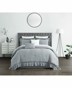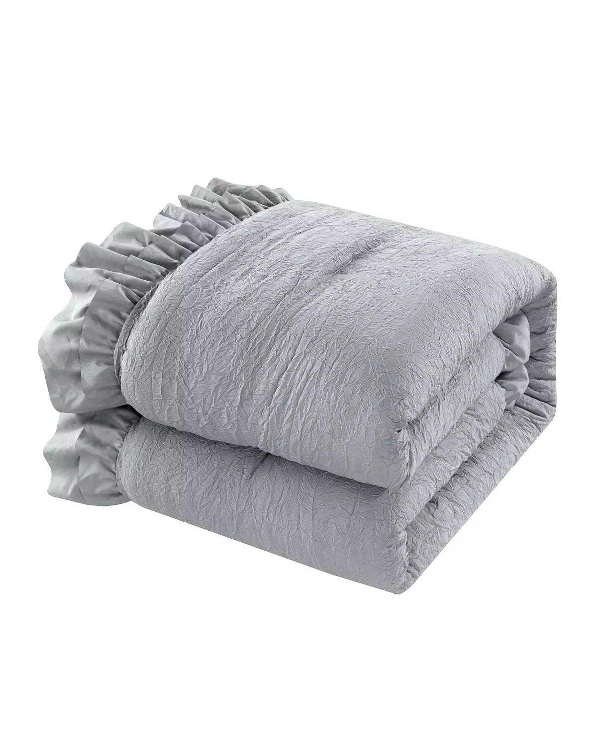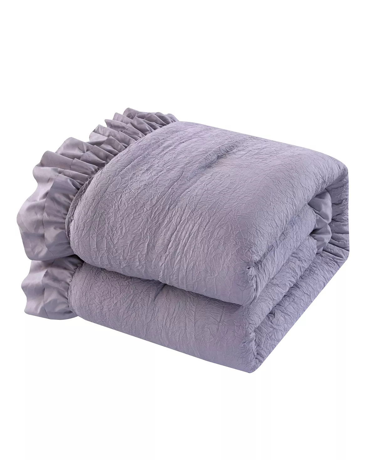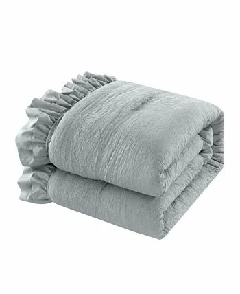 Change up your bedroom decor and give it a casual, laid back look with the unique Kensley comforter set from Chic Home. The comforter features a washed crinkle crush look on the face with a solid color backing and a double layer ruffled flange border.