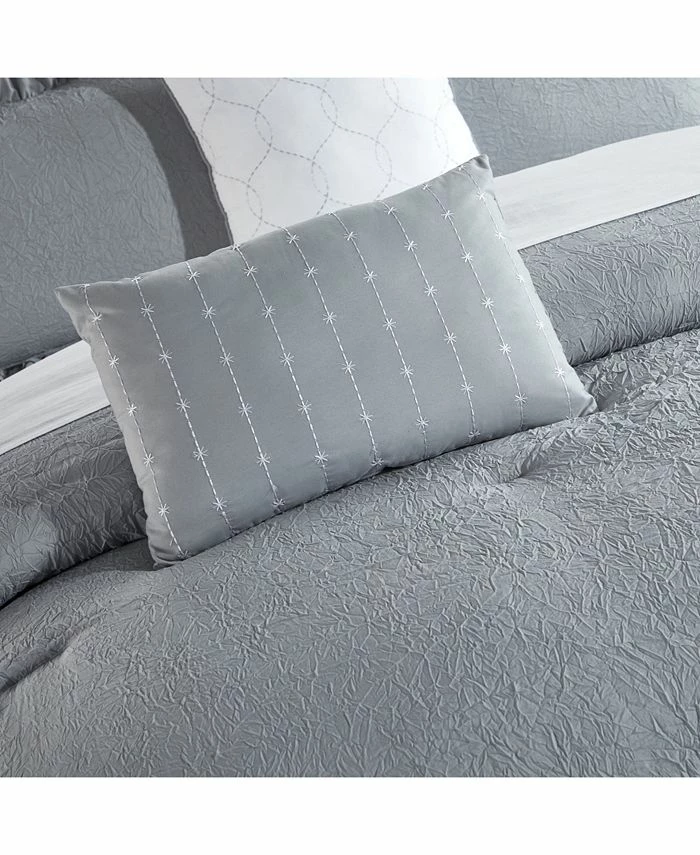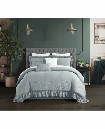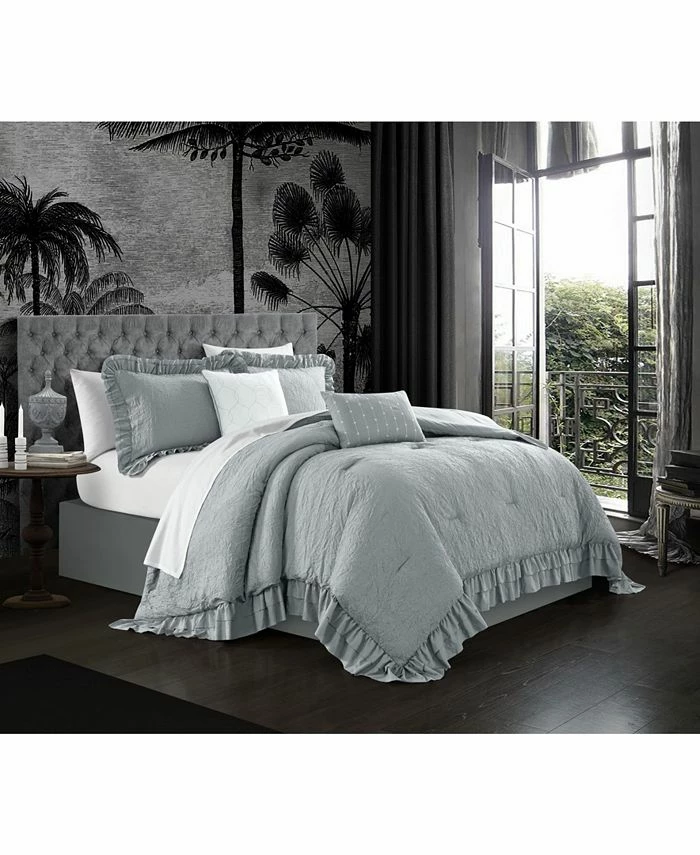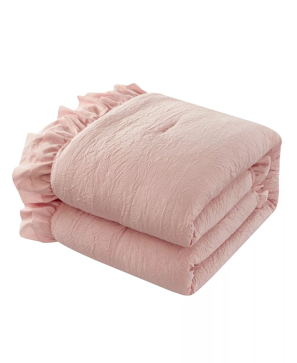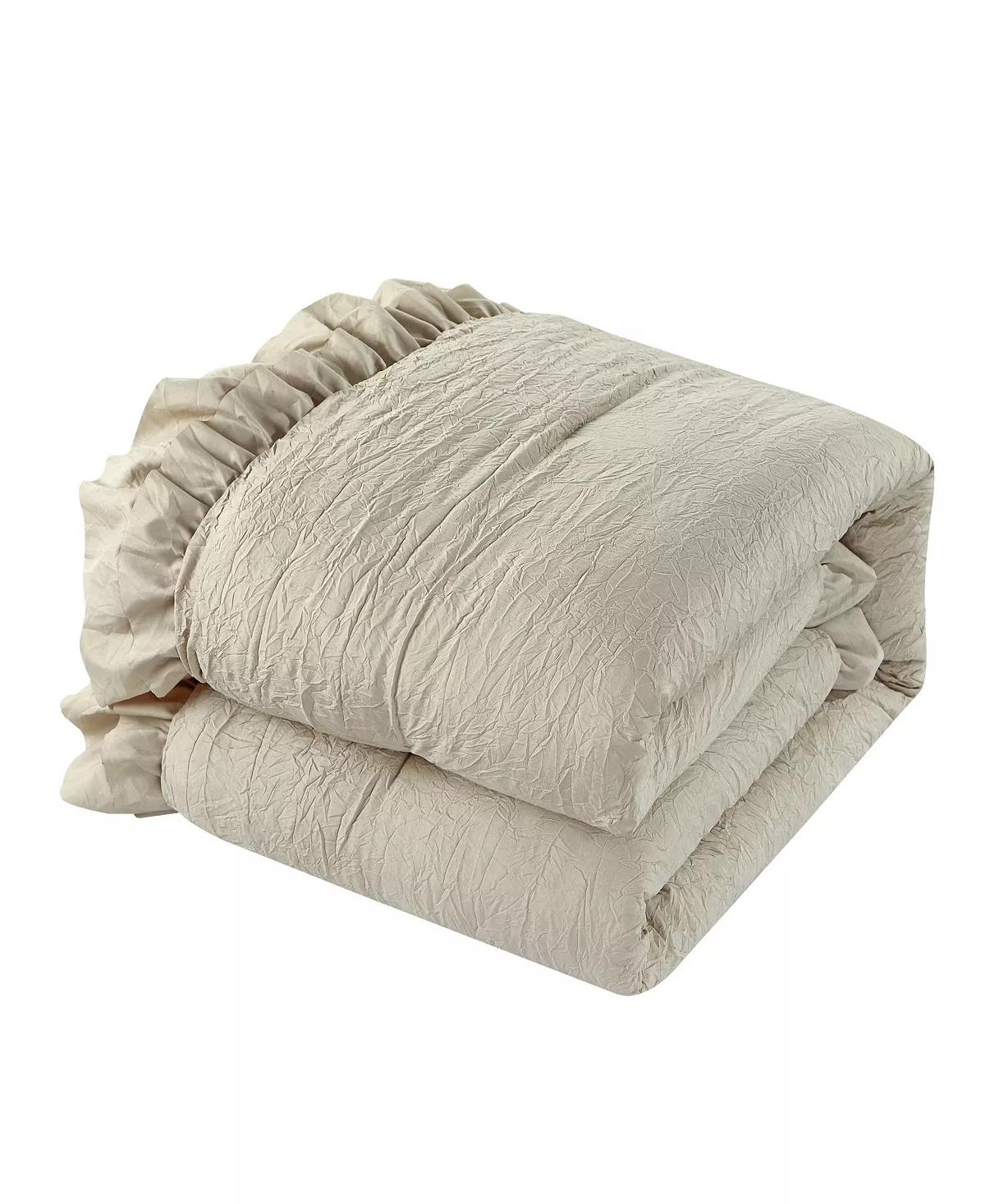 Change up your bedroom decor and give it a casual, laid back look with the unique Kensley comforter set from Chic Home. The comforter features a washed crinkle crush look on the face with a solid color backing and a double layer ruffled flange border.