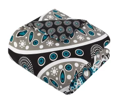- Boho-inspired large paisley and geometric patterned disperse print bleeds hues of blacks, taupes, and aquas on to a black ground