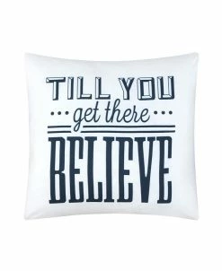 A fashion forward bedding features an elegant color block theme with geometric Ikat pattern and quilted details with a deco pillow with the inspirational message “TILL YOU get there BELIEVE”.
