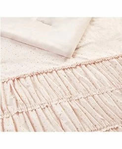 Sweet dreams await with the Madison Parker Celestial Princess comforter set. This stunning set features tiny metallic gold moons and stars printed on top of a pale blush solid ground sewn with lots of smocking.