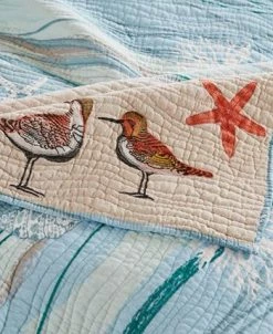 The beach life feels right at home with the maui quilt set. Awash in turquoise, teal, ocean blue waves and adorned with embroidered sea shells, corals and shore birds, the maui quilt features a beach sand border and reverse to an all over wave print. Prewashed and preshrunk.