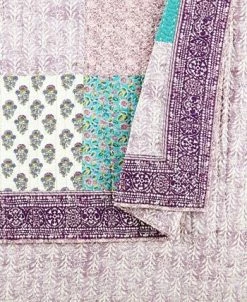 This new Jessica Simpson quilt adds a boho touch to your bedroom with the look of hand-crafted Indian prints. Small textured global floral prints in shades of purple and teal are pieced together in a pattern of big, bold squares. Beautiful pieces of velvet in a soft teal tone add an extra special tactile element to complete the luxurious look. Reverses to a distressed floral print in lavender hues.