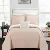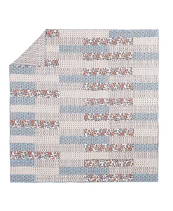 Jessica Simpson has designed a new quilt with a global vibe in shades of denim blues and burnt orange. Distressed florals with a block-stamped effect are pieced in a long brick quilting pattern. The reverse is a small floral on white.