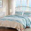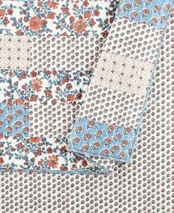 Jessica Simpson has designed a new quilt with a global vibe in shades of denim blues and burnt orange. Distressed florals with a block-stamped effect are pieced in a long brick quilting pattern. The reverse is a small floral on white.