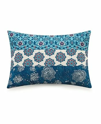 Lovely patchwork comforter inspired design with shades blue, aqua and coral in a distinct color palette reminiscent of refreshing water hues from the sea. The mix of medallion and Jacobean motifs with the look of hand printed fabric is both modern and timeless.