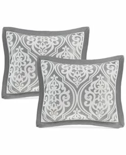 Revamp your bedroom with the Essentials Jordan room in a bag from Madison Park. The jacquard comforter creates a lavish look with its traditional ornate pattern and pieced design in rich hues of gray and white, while the coordinating shams reflect the motif seen on top of the bed. Four decorative pillows with embroidered details and a solid bedskirt provide the finishing touches to complete the collection. Also included are four solid window panels and two valances that allow you to create the perfect balance of style in your bedroom. Each window panel matches back to the bedding set and includes a tieback to give a clean and crisp finish to your decor.