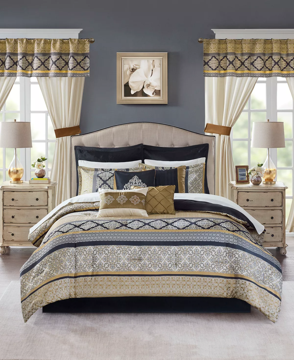 Completely transform your bedroom with the Madison Park Essentials Windsor 24 Piece Room in a Bag. The jacquard comforter and shams flaunt a chain-link design in rich black and gold hues that create an elegant contrast.