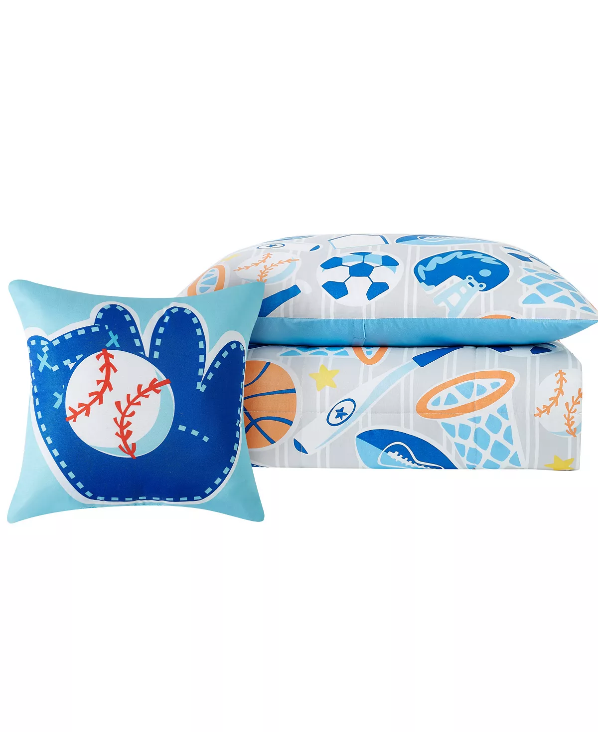 Take your pick with soccer, basketball, baseball, and football icons printed in bright blues on a gray woven fabric with all you need to complete the top of the bed.