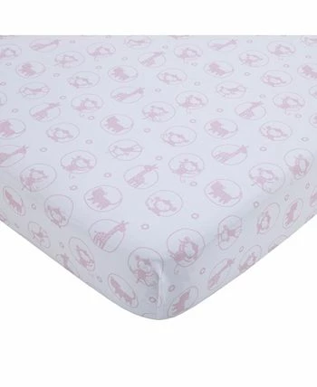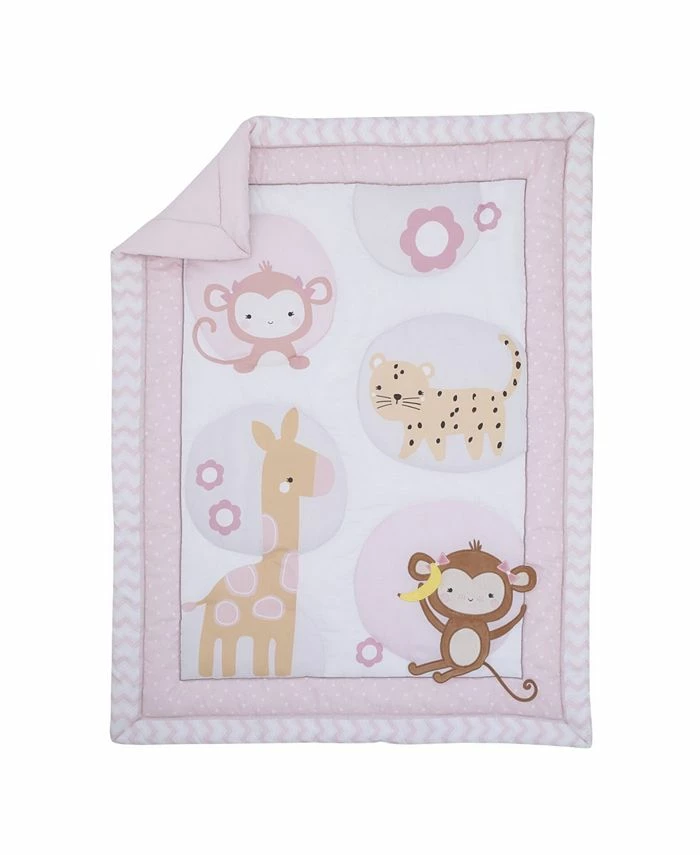 Sweet jungle friends 3 piece crib set includes a comforter, crib sheet, and crib skirt. Monkey, cheetah and giraffe are featured on the comforter in shades of pink, white and tan. The pink crib skirt has a 10″ drop length. The animal print crib sheet has elastic edges for a snug fit.